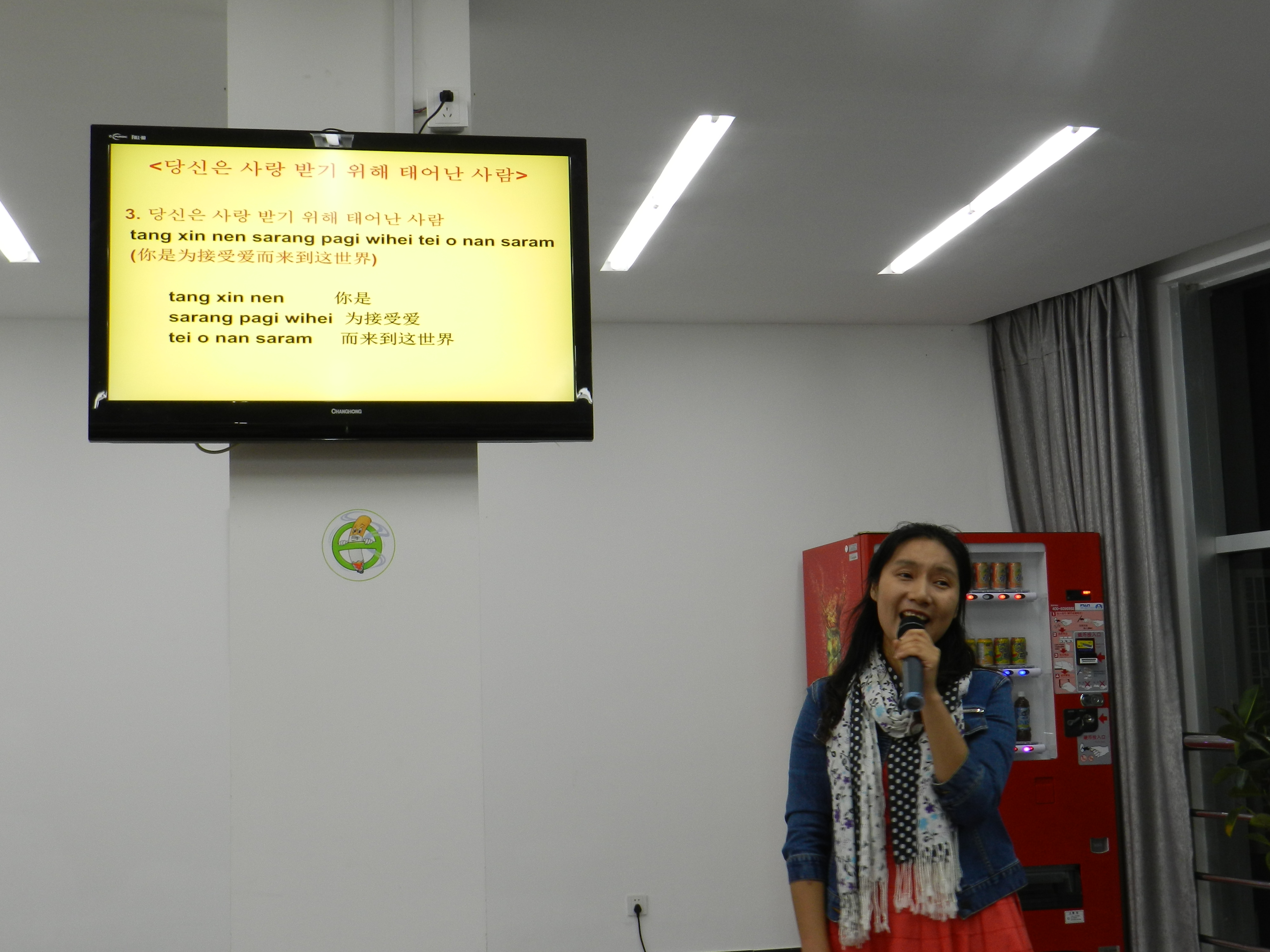 最后在外教"你是为接受爱而来到这世界''这首歌曲中结束了这次意义非凡的韩语角。此次韩语角的成功举办,为我们的大学生活添上了多彩的一笔,也增强了同学彼此间的交流,展现了同学们积极向上的学习面貌。