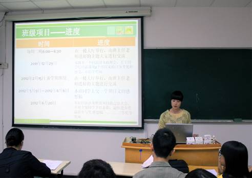 2011年11月2日中午,国际学院班集体特色项目化建设答辨会在外语楼举行。为了更好的给学生们提供更专业的意见,特按专业特色不同分为设计类班级与外语类班级在302教室和402教室分别展开答辩。国际学院团委书记徐俊杰老师和团委游华丽老师、国际学院团委管倩倩老师和韩淑清老师分别作为两个小组的评审员参加了此次答辩会。