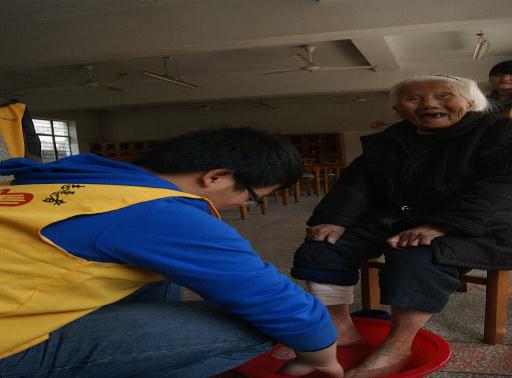 图为:国际学院志愿者正在为老人洗脚