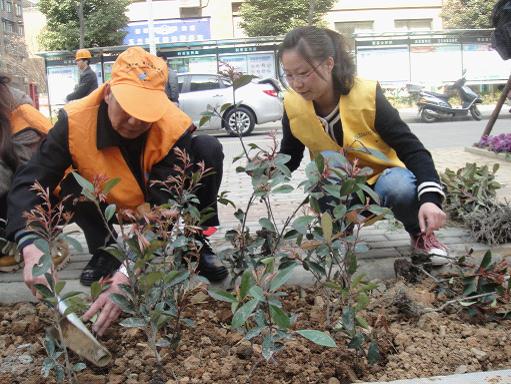 图为:国际学院志愿者和玉兰社区志愿者合作绿化
