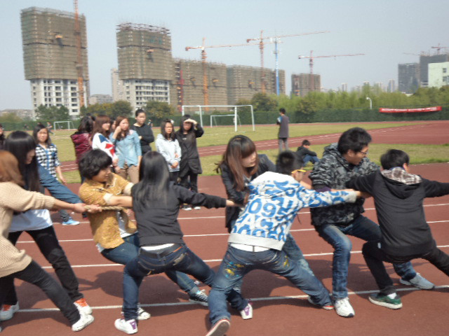 当比赛的哨声一响起,队员们口中一起高呼着“一二,一二”, 双手紧握长绳,开始拉了,此时男生个个涨的面红耳赤,女生也毫不示弱,放下平时淑女风范,使劲浑身力气,不顾一切的往后拉。各班其他同学也在为本班的队伍从旁边助阵加油,恨不得抓起绳子跟比赛的同学一起努力!同学们自发组成啦啦队为本班人员加油。裁判员的口令声,同学们的呐喊神,此起彼伏,飘荡在整个田径赛场上空。