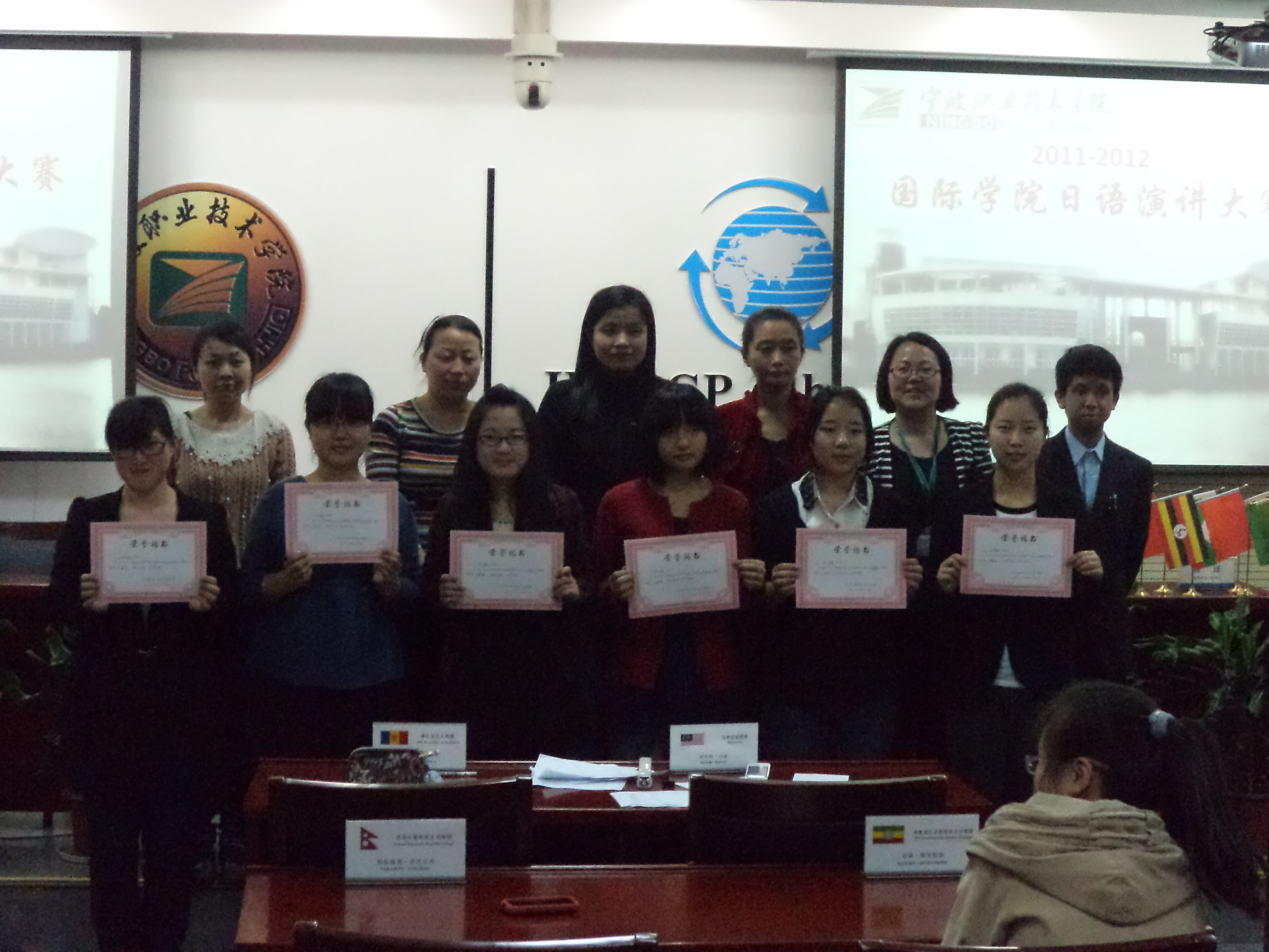 2012年4月19日,由宁波职业技术学院国际学院主办的2011-2012年度日语演讲大赛于中午12点30分在外语楼106教室举行。应日专业专业主任段丽娟老师,日语外教末?悠也,及日语专业李慧,杨维波等六名老师出席本次比赛并担任评委。