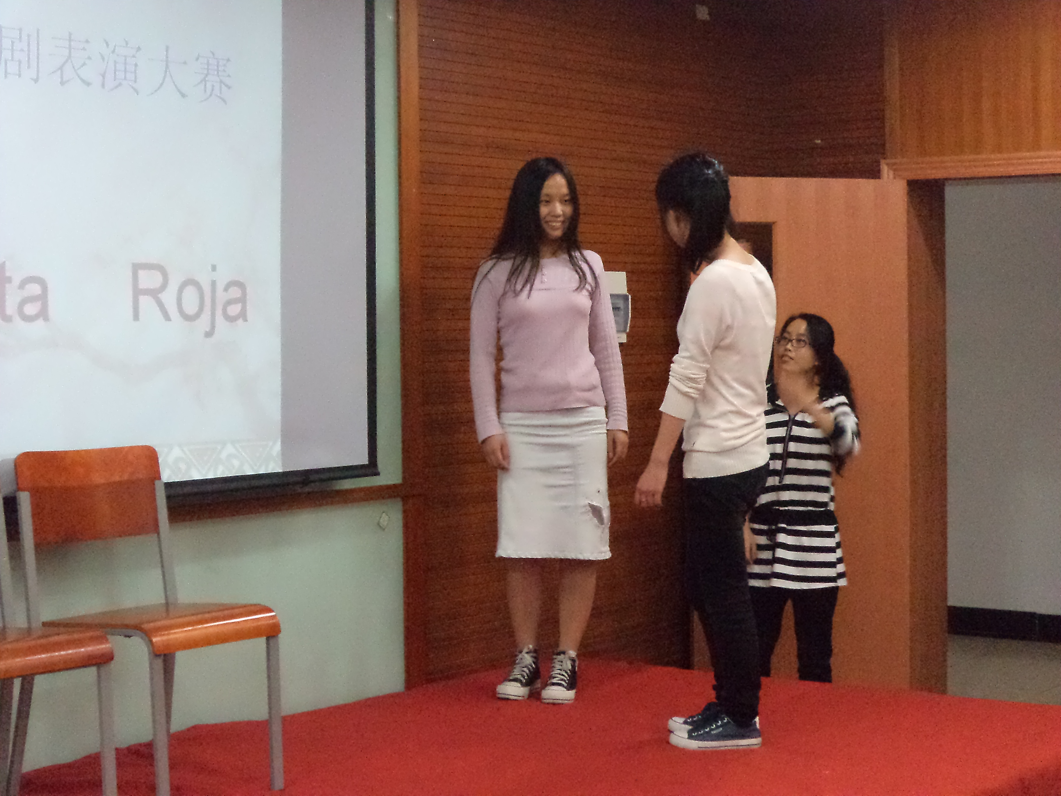 2012年4月24日下午,国际学院西班牙语专业的同学在外语楼102教室举行了一次西班牙语小红帽短话剧的比赛,出席本次比赛的评委有国际学院院长周英华老师,西班牙语专业老师翟红,外教Fabiana,团委老师应用西班牙语3110班班主任游华丽老师以及西班牙语专业全体同学。在比赛之前,班干部布置现场,现场布置的格外喜庆,准备的道具也十分齐全。同学们都提前10分钟到达现场。
