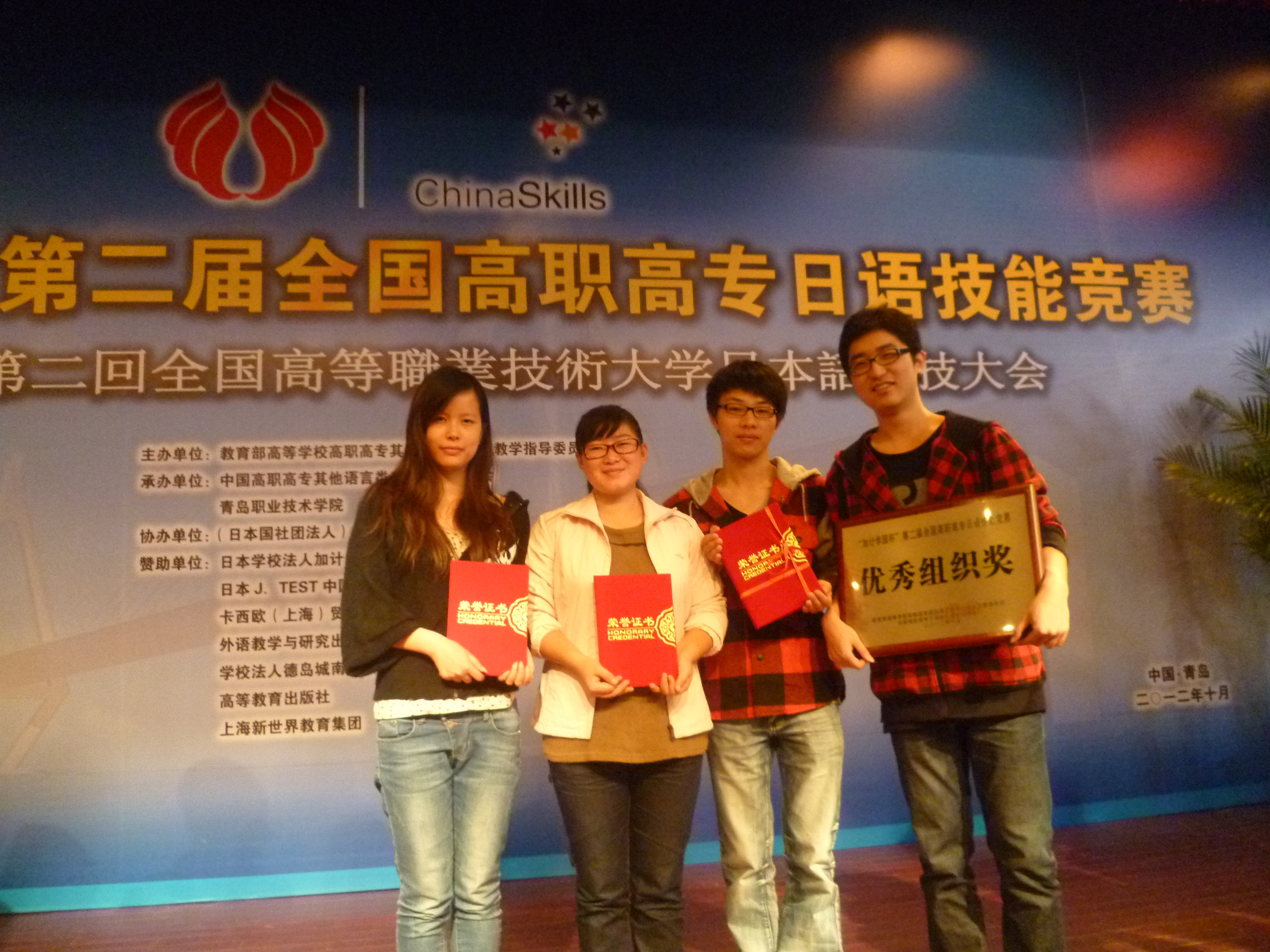 该次大赛是由教育部高职高专其他语言类专业教学指导委员会主办,高职高专其他语言类专业教学委员会和青岛职业技术学院承办、日本加计学园协办的第二届全国高职高专日语技能竞赛。参赛队伍来自全国12个省(自治区、直辖市)的42所高职院校,80名日语专业学生参加了比赛。此次竞赛由个人(命题演讲、问答)和团体(日语职业情景剧表演)两个赛项组成。