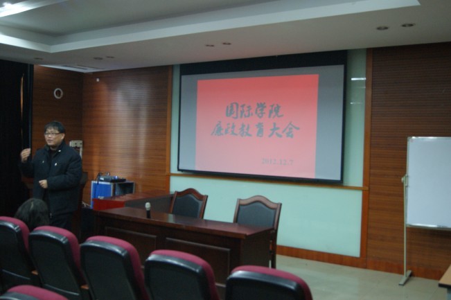 2012年12月7日下午2点,在艺术楼102教室举行国际学院廉政教育大会。国际学院副书记裘广宇主持大会,国际学院的教师党员参加了这次会议。