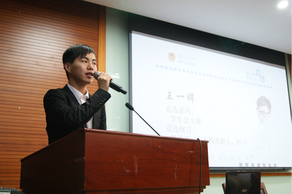 图为:学生会主席侯选人王一晖发表演讲