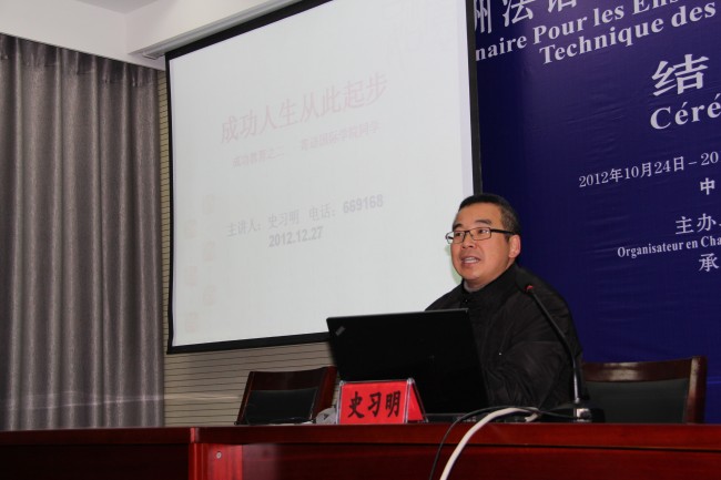 开班仪式过后,院党委副书记史习明老师以“读书与成功人生”为题,从实现成功人生的三大要素――目标、坚持、热情给所有的学员上了生动精彩的一课。他告诉同学们在大学生活中要合理、全面、健康的发展自我,并强调指出一个人要有正确的目标,坚持不懈地朝着目标去努力,怀抱热情,微笑面对一切,正确看待失败,永保进取心,通过自身的努力和奋斗,肯定能实现人生成功的大跨越。