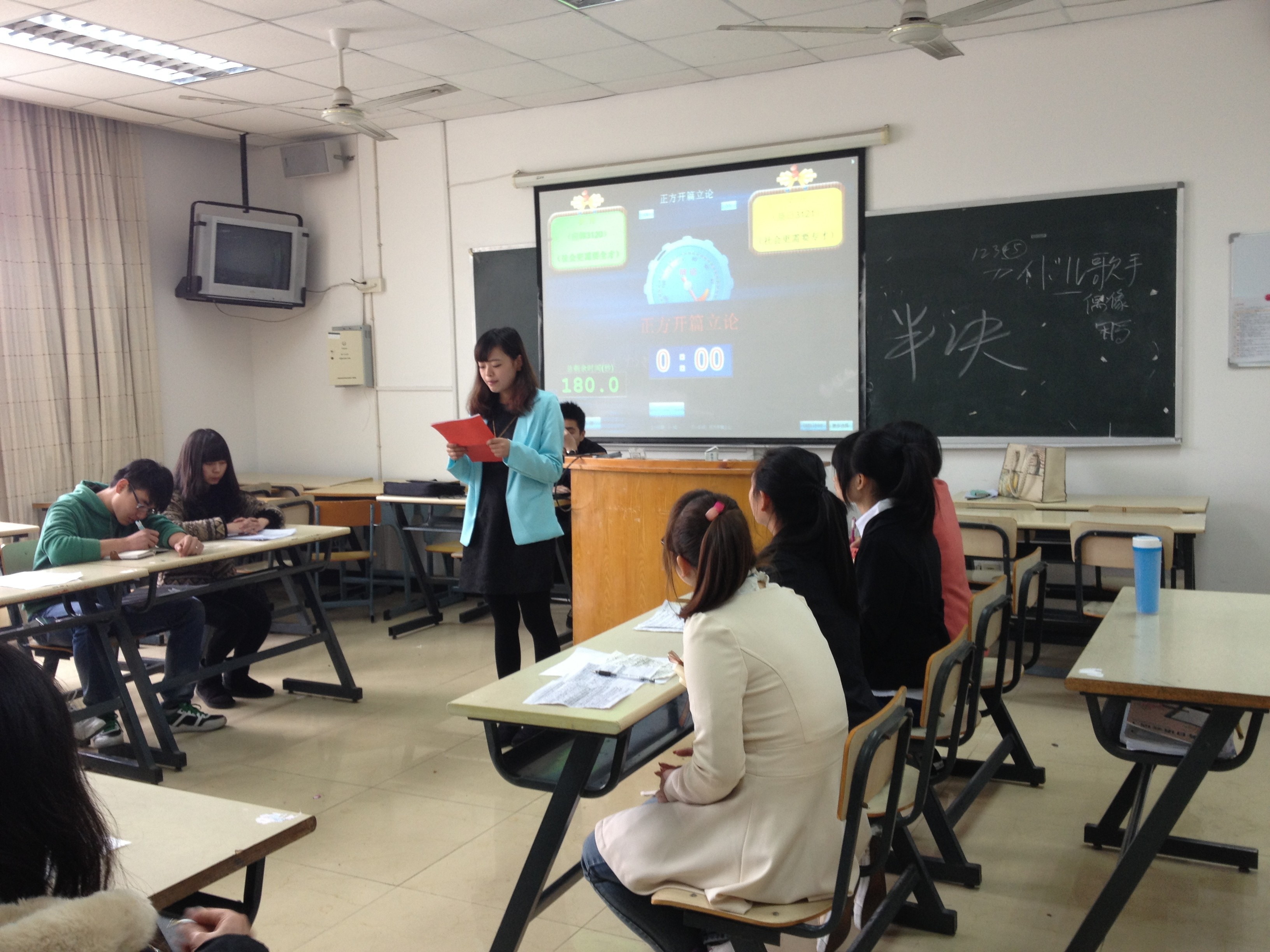 3月29号我院辩论赛在外语楼311举行半决赛,本次辩论赛开始!围绕社会更需要全才还是专才这一主题火热展开。由学习部部长陈颖、外联部部长卢方莉和纪检部部长杨海堂担任评委。主持人、评委、辩手、观众都已经就绪。12:10分,辩论赛开始了。