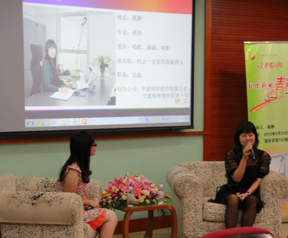 在同学们热烈的掌声下,陈总和主持人进入现场。主持人首先以最近热映的两部影片《致青春》和《中国合伙人》拉开了访谈会的序幕。在访谈过程中,陈总与在座同学们分享了自己的创业历程和心得。