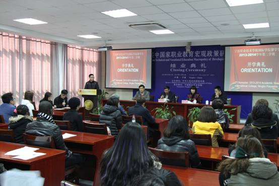 2014年3月5日14时,宁波职业技术学院国际学院留学生2013-2014学年第二学期开学典礼在外语楼106室隆重举行。学院副院长齐小萍,外事处副处长胡宇,国际学院院长吴柏祥,部分留学生任课老师和全体留学生出席典礼。