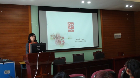 首先,毕砚女士进行自我介绍。概括性地讲述了她的经历以及所取得的成果。继而,抛出疑问为何选择德语,毕业后何去何从,引同学们深思。继而,引入正题,走进德企是个不错的选择。接着,就“Hape”公司的概况、使命、信仰、历史、公司在全球的分布情况等进行了深入的介绍。她着重强调公司着力于可持续发展,制作木制以及竹制玩具无毒无公害。旨在让孩子在玩乐中学习,更加创新。且“Hape”公司在慈善事业方面也有很大的贡献。最后,为同学展示了参加各个玩具展的剪影以及店面掠影。表示公司还需招兵买马,对同学们而言不失为一个机会。