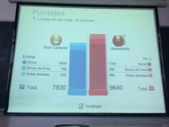 比赛在一切准备就绪后拉开了帷幕。由外教唱一首西班牙歌曲作为开场。其次,就是性格较为开朗的Joaquina和Dulce ,两位同学登台表演为大家献唱西班牙语版的《同一首歌》,她们精彩的演唱瞬间点燃了同学们的热情。这一声声洋溢着青春激情的声音,在初春的气息中弥漫着。随后外教和Emma的PK更是将全场气氛推向了一个新的高潮。 在几位同学轮番上场PK后,比赛难度随之增加,进入白热化阶段。最后的PK赛终于到来,由西语班的笑星Fernando和Cristina演唱《La taberna del Buda 》,两位同学通过对歌曲的完美领悟,发挥出了超长水平。最终,Fernando一举夺魁获得了本次比赛的冠军,他也因此被我们戏称为“歌神”。