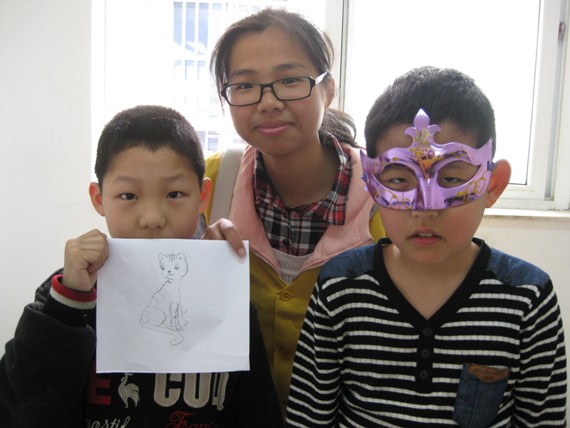 由于前几次,小朋友们的出色表现,新浦社区的支教负责人张老师今天给小朋友们发了小奖品——舞会面具。小朋友们异常兴奋,都迫不及待想戴在脸上,围着志愿者们做起了游戏。