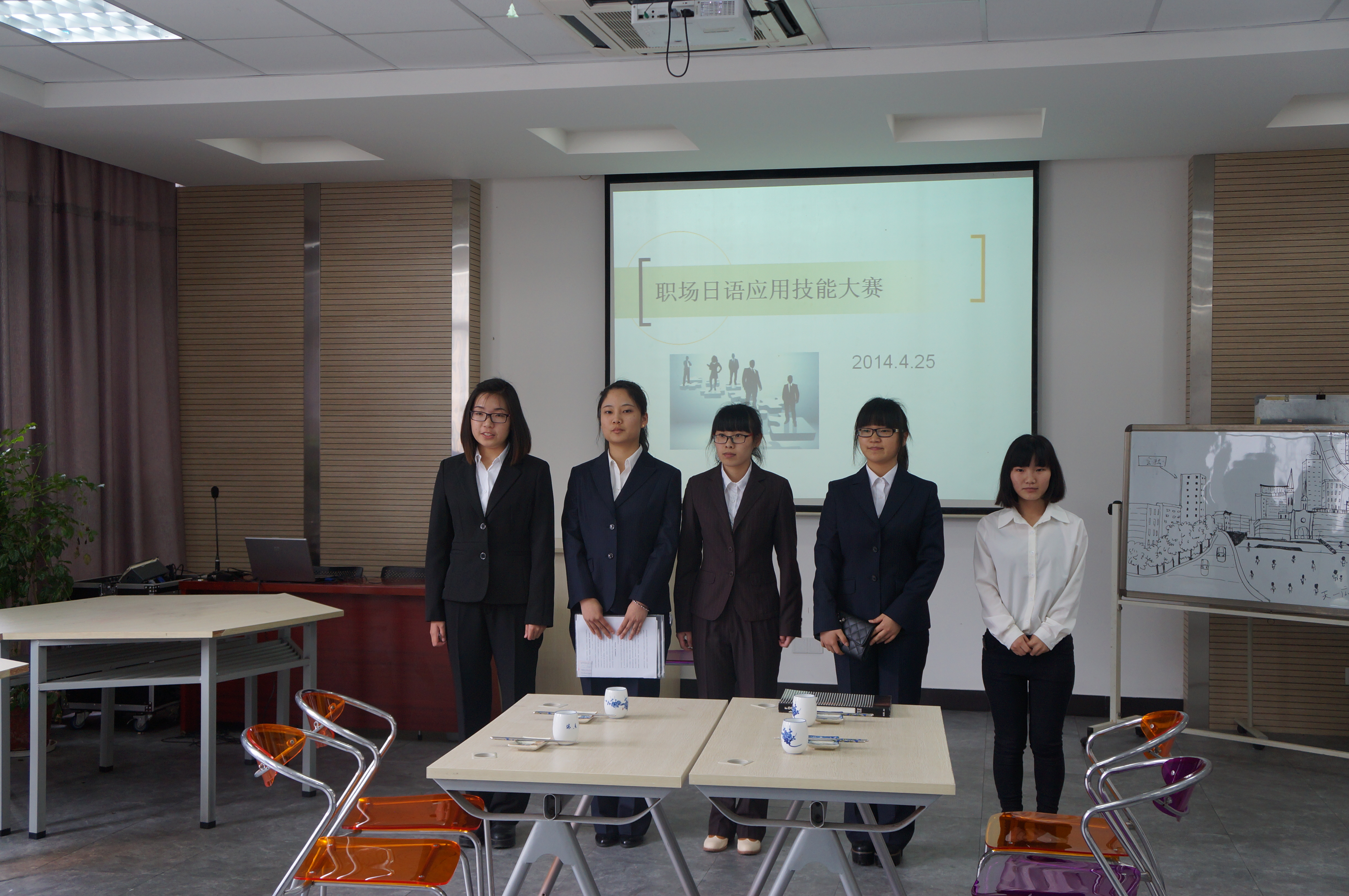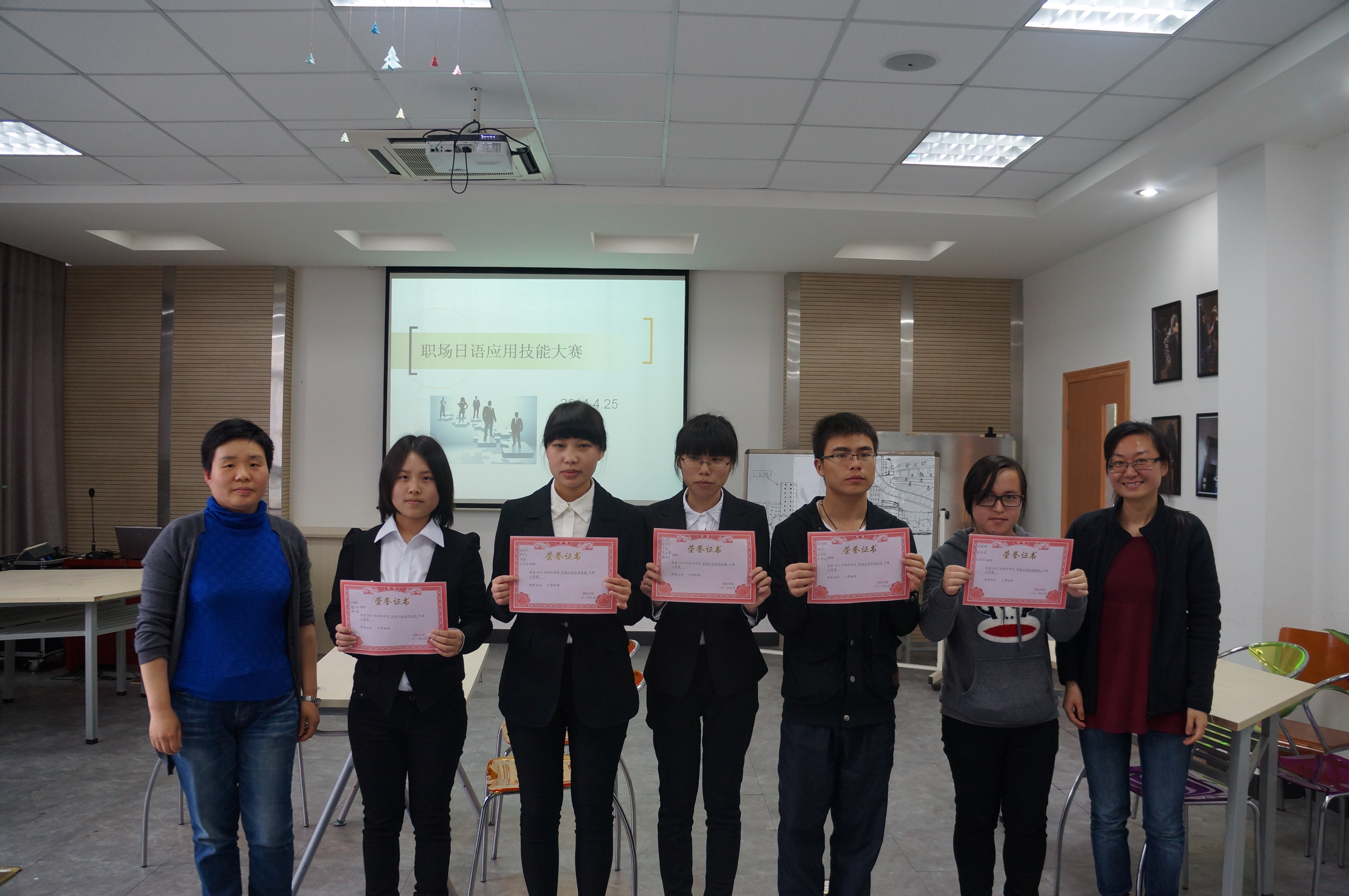 2014年4月25日中午时间12点50分,宁波职业技术学院国际学院职场日语应用技能大赛于国际学院104教室举行。本次大赛主要是针对大二班级的学生开展的,共分为9组。设一等奖1名,二等奖3名,三等奖5名。出席本次大赛的评委老师有刘爽老师、卢海英老师以及外教龙谷博老师、山本和美老师。