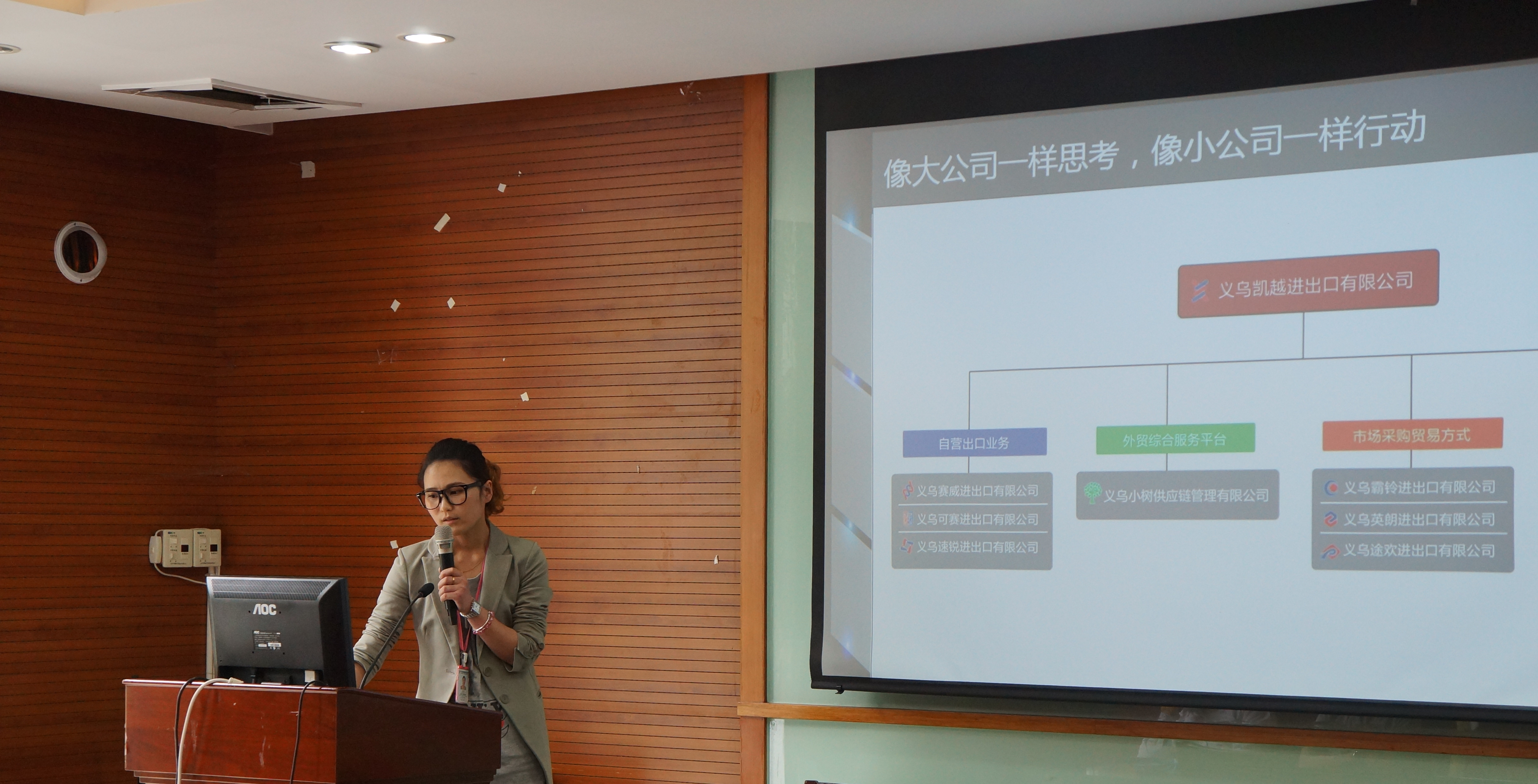宁波凯越集团的孟经理首先向同学们介绍了凯越的起源、发展壮大以及它的愿景和使命。宁波凯越国贸成立于2004年1月,英文名称为MARKET UNION,凯越国贸从14个人开始,30万元人民币起步,走过不平凡的十年后,在上万家公司中脱颖而出。凯越希望在全国多个地区建立采购分支体系,从而更好地为客户服务,实现“中国采购智慧,全球贸易服务”的公司发展理念。凯越国贸始终如一的坚持着像大公司一样思考,像小公司一样行动的理念。并拥有自己独特的人才理念:进取、创新、诚信、敬业、尊重和责任。随后,她又讲到了同学们最感兴趣的培训与发展,她表示凯越国贸倡导学生风气,并建立凯越学院,对中高层以及优秀员工及进行继续深造,完善内部讲师体系和岗位轮换等多层次培训和发展体系。