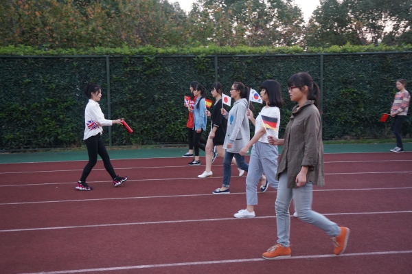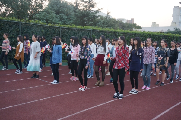 下午4点50分,记者到来时队员们已经站好队列,60个女生站成6列10排,使队伍充满了青春朝气和与众不同。指挥员一声令下他们开始做出出发的准备。当音乐响起时,他们一齐迈出整齐的步伐,在行进过程中喊着1、2、1、2的口号,井然有序。带领队伍的六名同学手中拿着6面代表着6种语言的大国旗,其他的队员手中拿着1面小国旗,这些国旗充分展现了国际学院的风采,旗子随着欢快的入场音乐在风中飞舞,甚是美丽。