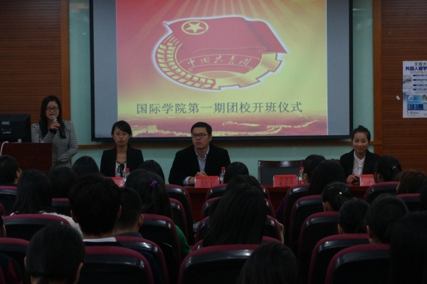 为了充分发挥团组织教育青年的功能,进一步加大对团员青年、团学干部的培养教育力度,培养高素质人才,国际学院于2014年11月12日下午三点在国际学院一楼会议厅举行第一期团校开班仪式,出席本次开班仪式的领导有我院团委书记励宁老师,国际学院党总支书记袁建萍老师、分院团委书记王欣老师以及全体学生会干部。