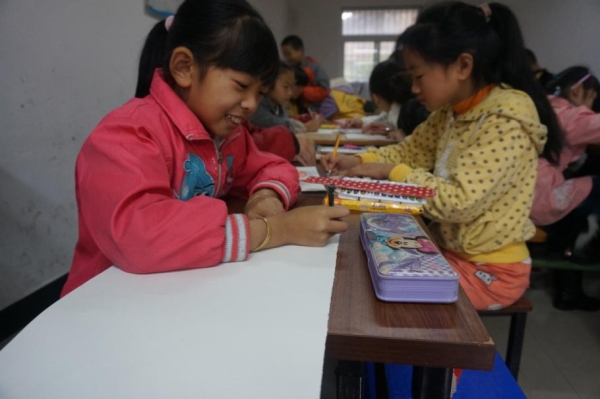 到达支教处后再队长王丹凤和副队长吴佳伦的分配下,形成两组各管一个楼层,在各自的教室里面志愿者都事先调整好座位和桌子,坐着热心等待小朋友来到并给予他们自己的帮助。