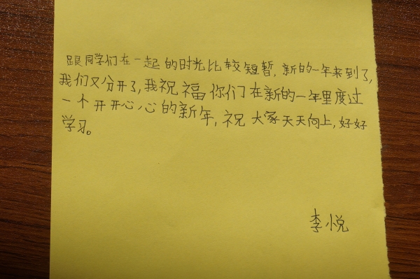 10分钟的课间休息后,便是小朋友们最喜欢的手工课了。本来今天手工课的内容是做风铃,由于小朋友们准备的材料不够充分,老师们便让他们自由发挥,做他们自己喜欢做的东西,释放自己的天性。有些小朋友在得知老师会折玫瑰花后,就兴致勃勃地学起了折玫瑰。有些更爱学习的小朋友再一次地开启了学霸模式,继续投入到书的海洋世界中。还有几个小朋友想到快要过新年了,便提前写了对其他小朋友的新年祝福,短短的几句话,可是却包含了这些天真无邪的小天使们最真诚的心。放学的时候,小朋友们把他们亲手做的“艺术品”送给了志愿者们,使得志愿者们更加开心了。