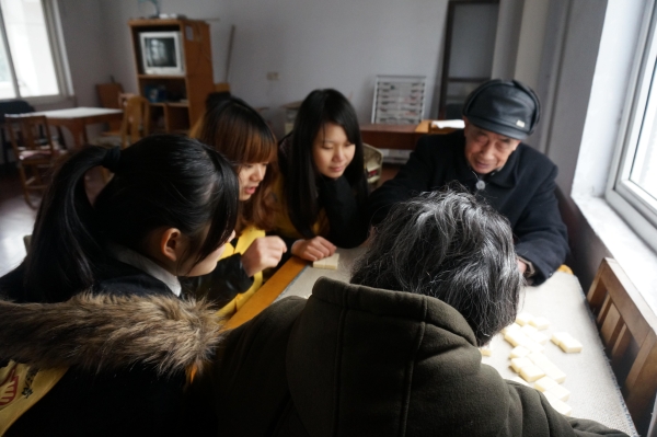 而另外一些志愿者来到了一间活动室,有几个老人在玩麻将,不过他们可不是在打麻将,他们用麻将玩连连看,这着实让志愿者们觉得“夕阳中”的老人童心未泯依旧。有的志愿者们参与其中,有的志愿者们为老人表演节目,老人的笑脸是他们最好的回报。