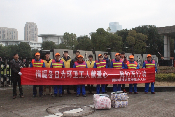 1月16日清晨,在国际学院团委书记王欣老师的带领下,国际学院志愿者服务大队的王伟涛同学以及其他三位队员为辛勤服务我们学校周边环境的环卫工人们献上了冬日里温暖的口罩和手套,也为这为期一个月的暖冬行动拉下了帷幕。