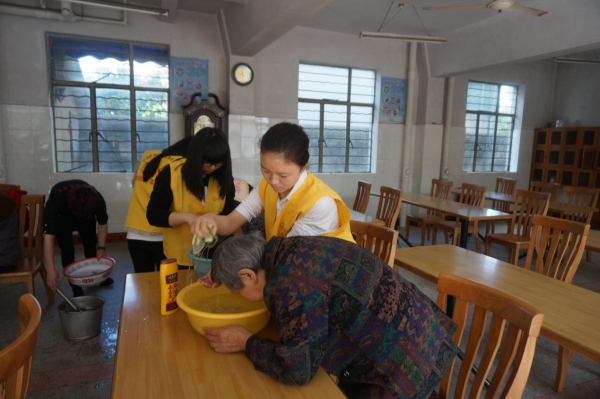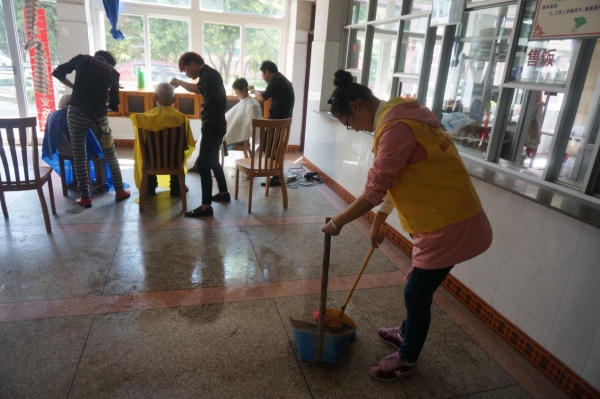 在活动结束后,部分志愿者们坦言还是第一次为别人洗头,更何况是帮长辈洗头,生怕自己手法不够娴熟弄痛了老人家。即使如此,老人们对这次体验还是一致的好评连声道谢。看着年龄和自己孙儿相仿的志愿者们的贴心照顾,一些老人在等待理发时还和志愿者们聊了起来。老人们会问志愿者一些例如:你是哪儿人啊、在哪里读书、读书辛不辛苦的问题。虽然存在语言沟通的障碍,但在服务阿姨的帮助下志愿者们还是和老人聊的非常尽兴。而另一边,其他志愿者的打扫工作也在继续开展着。