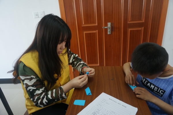 图为:志愿者和小朋友一起折纸