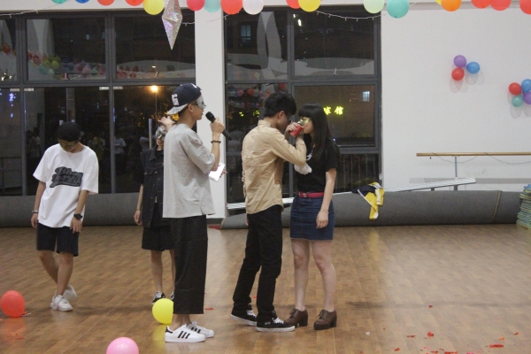 紧接着,在主持人热情的鼓动下,四队情侣展开了激烈的挤气球比赛,男女同学配合默契,进行了很好的互动,引来了同学们的阵阵欢呼,现场气氛可谓是达到了一个高潮。当然,如此之嗨的假面舞会怎么能少了我们可爱的同学们呢?在节奏明快的音乐下和舞蹈高手的带动下,带着面具各种装扮的同学们都开始了放松的交流和互动,其中更不乏有来自国际友人的富有民族特色的舞蹈,活力十足!让人每个细胞都在叫嚣释放,热情舞动,调动全场!激情过后,我们又迎来了游戏环节——抢凳子。这真是游戏之王啊,每逢活动都少不了它。当然,舞会也少不了我们同学美妙的歌声暖场才使得此次活动圆满成功。同学们在一片欢声笑语中井然有序的离场,笑声不时在在耳边回荡。