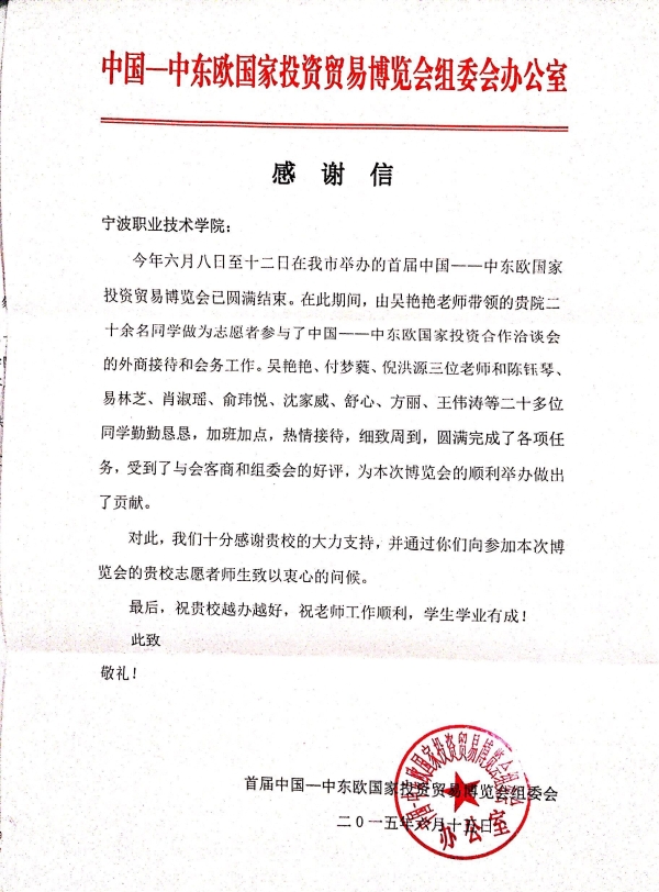 近日,国际学院收到了一封来自中国——中东欧贸易投资贸易博览会组委会的表扬信,内容是表扬国际学院师生在首届中国——中东欧贸易投资贸易博览会中的做出的努力,为国际学院、宁波职业技术学院赢得的声誉给予了高度评价。