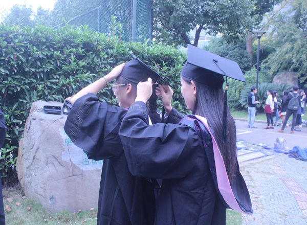 图为:毕业生相互整理学士帽