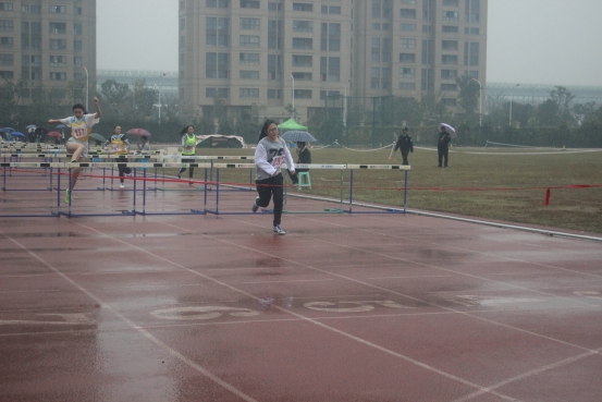图为:女子跨栏比赛国际学院选手夺冠现场