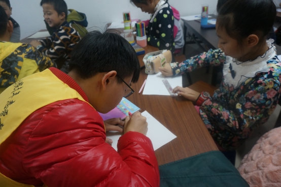 等到小朋友们都做完作业后,志愿者们便开始教他们设计手抄报,孩子们并不知道什么是手抄报,志愿者们就耐心讲解,并手把手教他们。小朋友们认真地听、认真地看、认真地学。