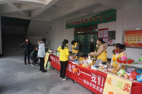 2015年12月23日至25日中午,宁波职业技术学院国际学院的志愿者部门在食堂门口,正式开始了为期三天的“暖冬为环卫工人献爱心”大型义卖活动。