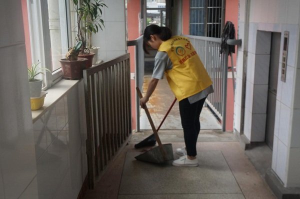 志愿者们动作利索,刚到达福利院便领到工具,开始打扫。扫地、拖地、擦窗户、扶手......只见一个个黄色的身影在院子里、楼道间不断地穿梭。老人们看着一个个熟悉的黄马甲,脸上露出了欣慰的表情。
