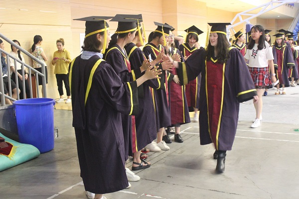 典礼开始前,屏幕上放映了毕业生在校三年青春的剪辑,引起了在场毕业生共鸣。接着主持人上台致辞,介绍今年的毕业典礼有一个特别的仪式:毕业生在上台前要先与班级同学一一击掌。