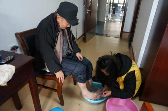图为:志愿者在给老人修剪指甲