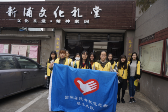 图为: 国际学院志愿者们在新浦文化礼堂门口的合影