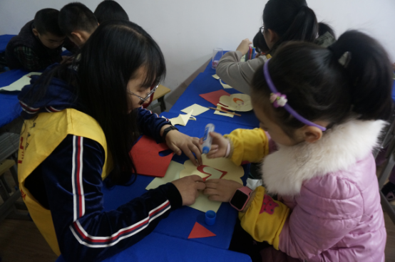 图为:  志愿者和小朋友一起制作贺卡