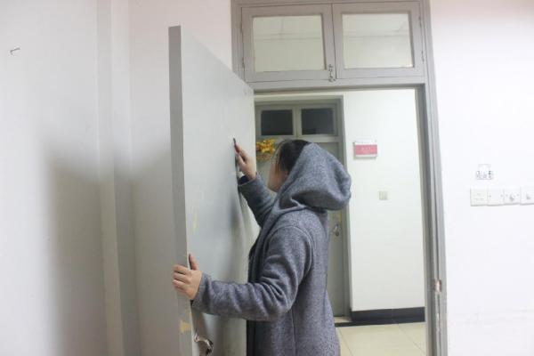 图为:应西3160的同学正在清除门上的双面胶