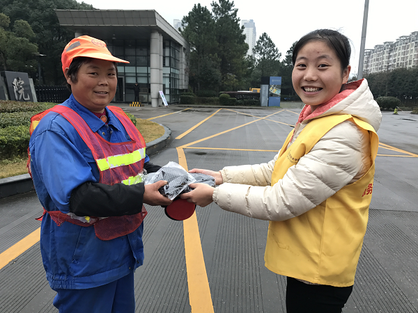 为向辛勤工作在一线的环卫工人们致敬,并向其送上一片温暖与感谢。2017年1月5日中午,国际学院志愿者服务大队的成员们为清扫宁波职业技术学院周边环境卫生的环卫工人们献上了冬日里温暖——口罩和手套等生活用品。