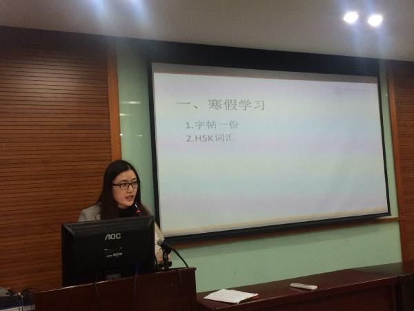 国际学院汉语国际教育教研室张琼老师主持本次会议并首先向留学生分发了汉字字帖及HSK词汇表,详细布置了留学生们寒假期间需要完成的作业,并强调了宿舍安全等方面内容。随后外事处张晋楚老师重点就学生签证事宜向学生作了说明并解答了学生的疑惑。社区办刁如乾老师再次就寝室用电安全、外出交通安全、防火防盗防骗等方面对学生进行了温馨提醒。保卫处许道春老师提醒学生寒假期间只有靠近西校区的大门是开放的,其他校门都将关闭,并再次提醒学生遵守寝室管理规定,每天按时回校,不要晚归。最后,国际学院党总支书记袁建萍老师进行总结性发言,再次强调了安全是第一要务,要时刻牢记心中,并预祝留学生们度过一个开心快乐的寒假和新年。