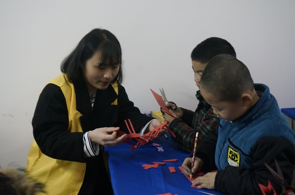 图为: 志愿者们和小朋友们剪喜字