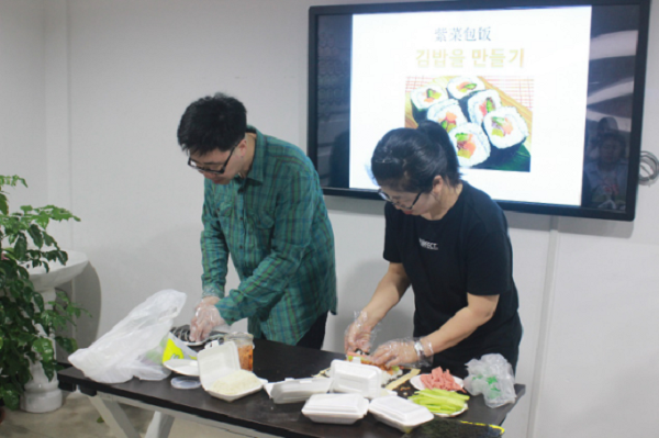 说起韩语,让人想到风靡全球的韩剧,而作为学习韩语的学生,应韩2160的同学更是对韩剧了如指掌。活动的第一个内容是为三段不同韩国影视作品的片段配音,让观众们来猜测这个影视作品来源于哪一部电视剧。大家都争相猜测,场面十分活跃。在结束有趣的配音环节后,等待大家的是韩国美食。这次的美食并不是买来这么简单,而是由韩语外教金老师和朴老师亲手制作的紫菜包饭。到后来,不仅是老师制作,同学们自己也开始自己动手,尝试了一回,体验了一番自己制作美食的乐趣。