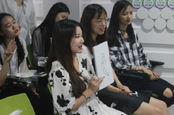 美食环节过后,就到了游戏环节。此次游戏具有一定难度,是通过你画我猜的方式,用对应词语的韩文来进行回答。这个小游戏继美食环节之后,再一次把活动推向了高潮。
