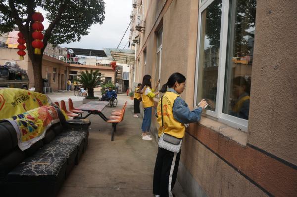 在带队队长的领导下,志愿者们快速拿好了清洁工具进行卫生清洁工作。志愿者们分为两小组,一组提水,用抹布认真的擦洗污渍的玻璃,另一小组则是清扫院子里的落叶,为老人们营造一个舒适干净的环境。志愿者们忙碌的身影成为了那小小院子中一道最为亮丽的风景线。