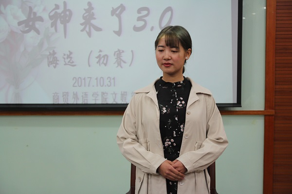 2017年10月31日中午12:00许,商贸外语学院于7号楼102教室举行了第三届女神来了初赛。出席本次大会的评委有商贸外语学院主席团助理吴文芬、屠吉雨、陈元锋、李嘉霖, 商贸外语学院文娱部长助理任倩倩、商贸外语学院部长助理徐峰,主持比赛的为罗靖伟同学。