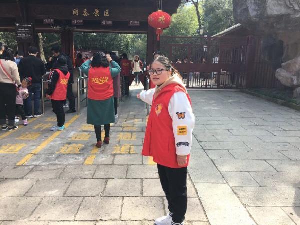 经过一段的路程,志愿者们到达九峰山,分成三队展开今日的活动。在负责人的带领下,志愿者们迅速地展开了工作。随着游客数量的增多,志愿者们都能以对其认真指导和服务,原本杂乱的队伍变得井然有序。尽管工作疲惫,他们依然面带微笑,坚守岗位,为自己这绵薄之力而感到无比的自豪。