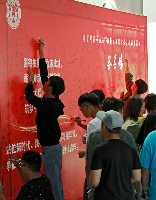 在新生的开学典礼上,722名新生认真阅读了“不忘初心立志向、牢记使命勇担当理想信念”理想信念倡议书,在签名墙上庄重地签上了自己名字。入党积极分子黄成同学向在场的新生发起倡议,号召全体新生站位新时代、践行新思想、书写新华章,争做有理想、有本领、有担当的新时代青年,在大学三年不忘初心,砥砺前行。