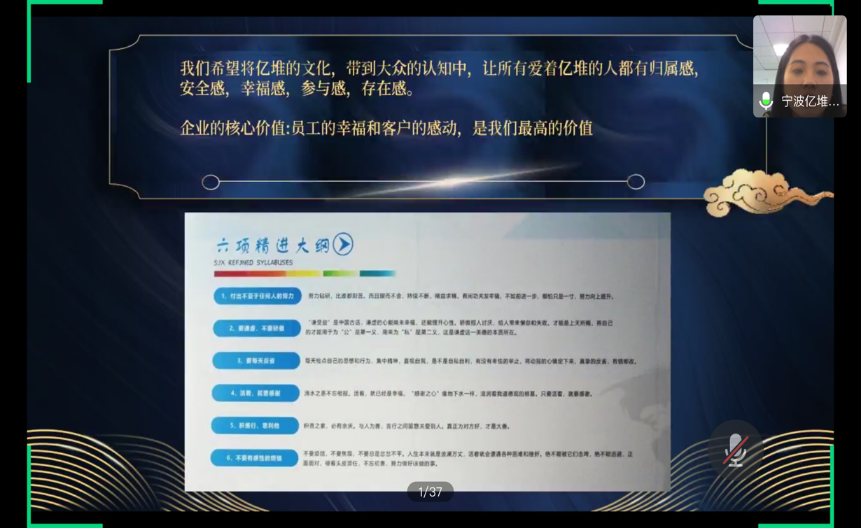 图为:主讲人向同学们介绍公司的六项精进大纲